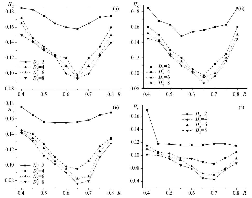 Рис. 7. Зависимость коэрцитивной силы Hc от отношения обменных интегралов R при различной толщине магнитомягкой составляющей D2 для сплошной пленки и пленки с разными периодами решетки антиточек d: (a) сплошная пленка; (б) d=16; (в) d=8; (г) d=4.