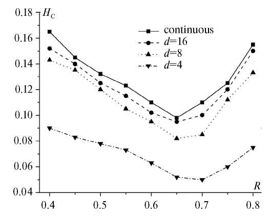 На рис. 7 представлена зависимость коэрцитивной силы Hc от отношения обменных интегралов R при различной толщине магнитомягкой составляющей D2 для сплошной пленки и пленки с разными периодами решетки антиточек d.