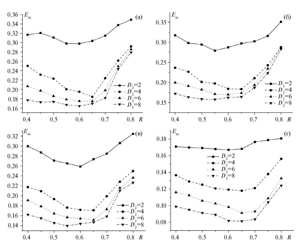 Рис. 9. Зависимость энергии перемагничивания Em от отношения обменных интегралов R при различной толщине магнитомягкой составляющей D2 для сплошной пленки и пленки с разными периодами решетки антиточек d: (a) сплошная пленка; (б) d=16; (в) d=8; (г) d=4.