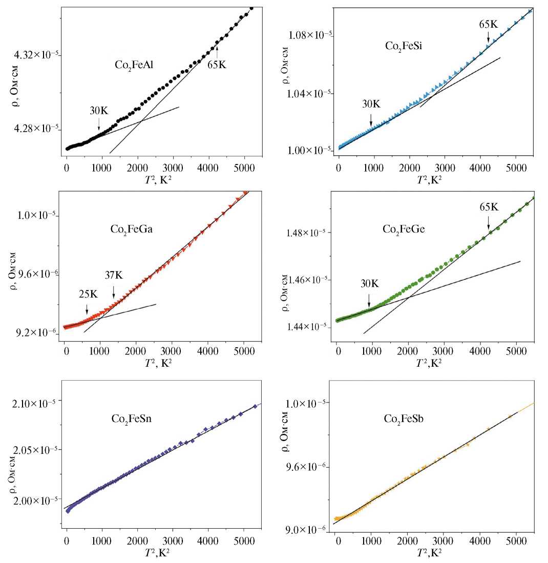 Рис. 3. Зависимости электросопротивления сплавов Co2FeZ (Z = Al, Si, Ga, Ge, Sn, Sb) от квадрата температуры в интервале от 4.2 K до 75 K.