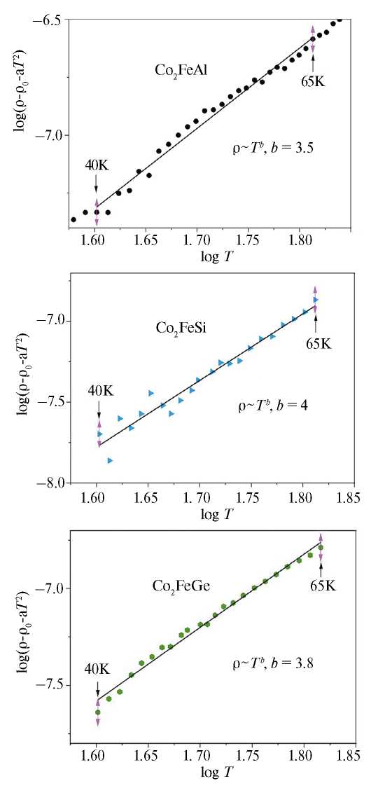 Рис. 4. Зависимости логарифма log(ρ–ρ0–aT2) от логарифма температуры log(T) для Co2FeAl, Co2FeSi и Co2FeGe в интервале температур от 40 K до 65 K.