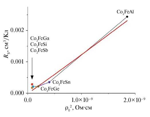 Согласно теории аномального эффекта Холла [31], аномальный коэффициент Холла RS содержит вклады различных механизмов рассеяния — на примесях, фононах и спиновых неоднородностях, которые приводят как к линейным, так и к квадратичным членам в зависимости RS от электросопротивления ρ. Как видно из рис. 7, эта зависимость для исследованных сплавов Co2FeZ (Z = Al, Si, Ga, Ge, Sn, Sb) может быть описана как RS ~ ρk, где k = 2.06 ± 0.18.