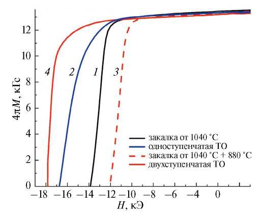 Рис. 1. Кривые размагничивания магнитов после первичной ТО, закалки от 1040°С (1) и последующих ТО: 2 — одноступенчатая ТО (ТО2 при Т2=480°С (1 ч)); 3 — ТО при Т1=880°С (1 ч); 4 — двухступенчатая ТО (ТО1 при Т1=880°С (1 ч) + ТО2 при Т2=480°С (1 ч)).