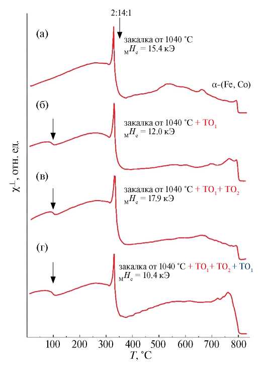 Рис. 3. Температурные зависимости магнитной восприимчивости χ┴(Т) магнитов, измеренные поперек направления текстуры, после закалки от 1040°С (а) и последующих ТО: (б) ТО1 при Т1=880°С; (в) двухступенчатая ТО (ТО1 при Т1=880°С и ТО2 при Т2=480°С); (г) двухступенчатая ТО + ТО1 при Т1=900°С.