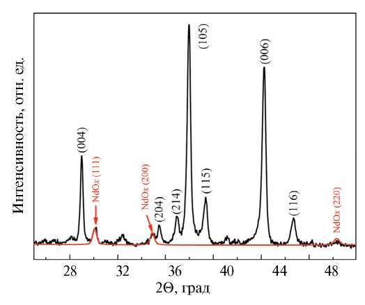 Рентгеновская дифрактограмма, снятая с поверхности шлифа магнита после первичной ТО, показана на рис. 4. Сравнение интенсивности линий (105) и (006) (I(105)/I(006)=1.22) качественно характеризует степень текстуры магнита после спекания Тсп =1040°С [32]. Кроме линий основной фазы (Nd, Pr)2Fe14B на дифрактограмме присутствуют линии (111), (200) и (220) фазы NdOx.