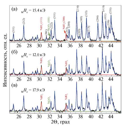 Рис. 5. Порошковые дифрактограммы образцов после закалки от Тсп (а) и последующих ТО: (б) ТО1 при Т1=880 °С; (в) двухступенчатая ТО (ТО1 при Т1=880 °С и ТО2 при Т2=480 °С). Черная кривая — эксперимент, синяя кривая — расчет для основной фазы Nd2Fe14B, красная кривая — расчет для фазы NdOx, зеленая кривая — расчет для фазы Nd2O3.