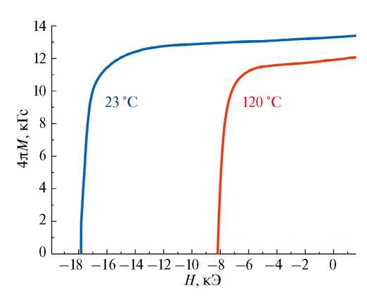 Кривые размагничивания магнита из сплава состава (Nd, Pr)31.9Feост.(Co, Cu, Al, Ga)1.5B0.8 (рис. 8) были измерены в диапазоне температур от комнатной до 120°С. Температурные коэффициенты α и β рассчитаны по формулам (1) и (2), соответственно. Получены следующие значения: α = –0.11 %/°С, β = –0.54 %/°С: