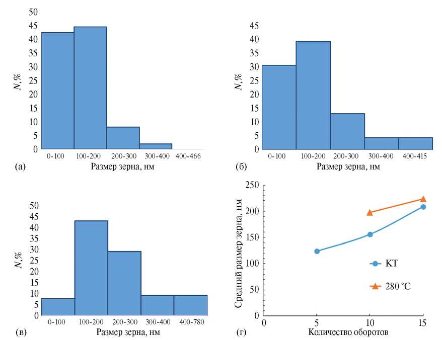 Рис. 4. Влияние числа оборотов наковальни и температуры деформации на размер зерен сплава АЛТЭК: а — распределение зерен по размерам в сплаве после 5 оборотов при КТ; б — после 10 оборотов при КТ; в — после 15 оборотов при 280°С; г — изменение среднего размера зерен.