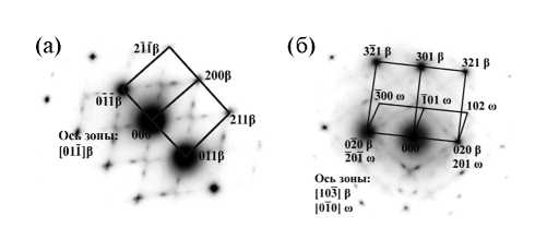 На дифрактограмме сплава Ti–14Mo после закалки, кроме дифракционных максимумов b-фазы, присутствуют отдельно стоящие дифракционные линии w-фазы (рис. 1б), и на всех электронограммах зафиксированы четкие рефлексы w-фазы (рис. 2б).