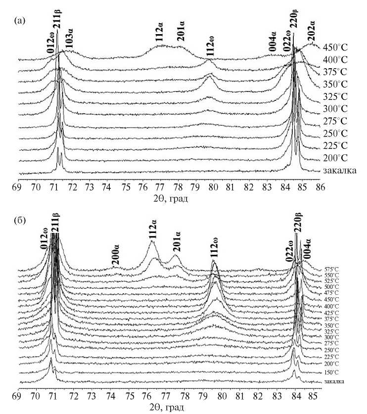 При температурах старения от 225°С и выше до 400°С на дифрактограммах установлено наличие дифракционных линий ω-фазы (рис. 4а). При этом с повышением температуры старения до 350°С их интегральная интенсивность активно растет, а значит, растет и объемная доля ω-фазы. Образование ω-фазы, как известно [5, 7, 10–12], в данном случае идет по промежуточному механизму, обозначим ее как изотермическую ω-фазу (ωизо).