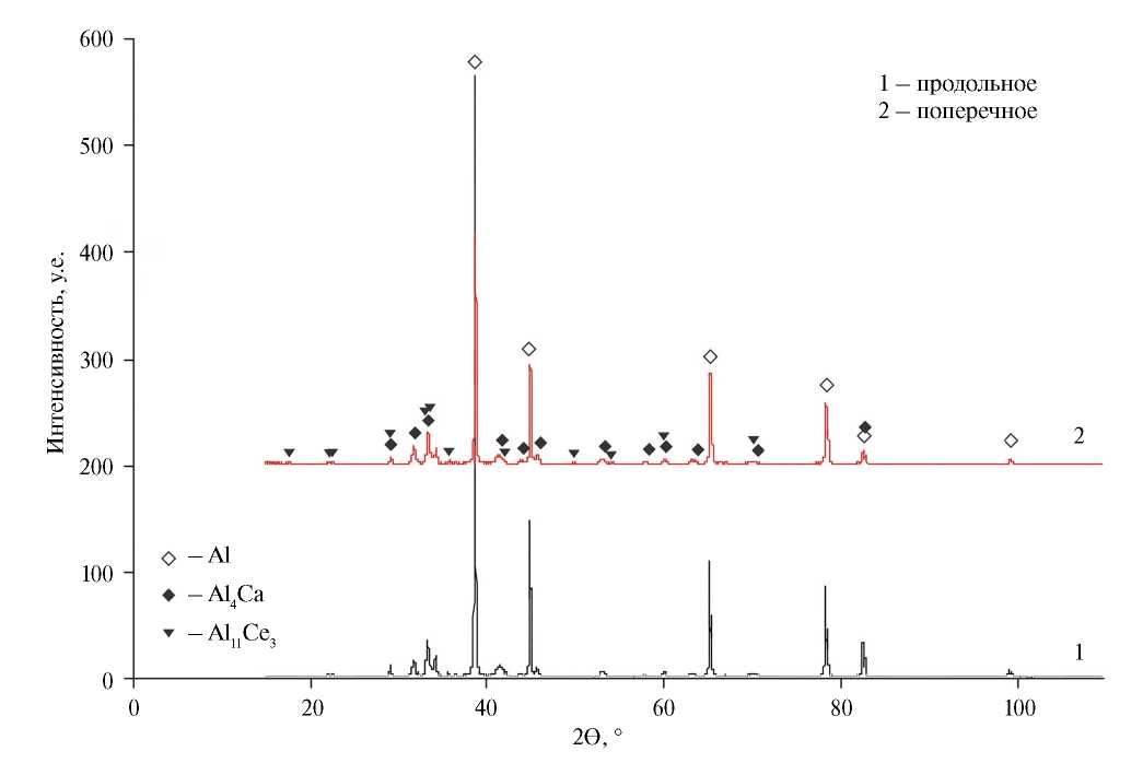 Рис. 5. Рентгенограммы сплава Al–6Ca–3Ce после РКУП, полученные в продольном и поперечном сечении образца.