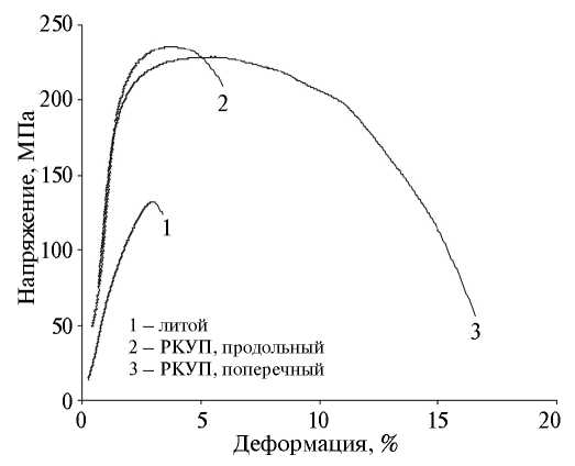 Рис. 6. Кривые растяжения сплава Al–6Ca–3Ce до и после РКУП.