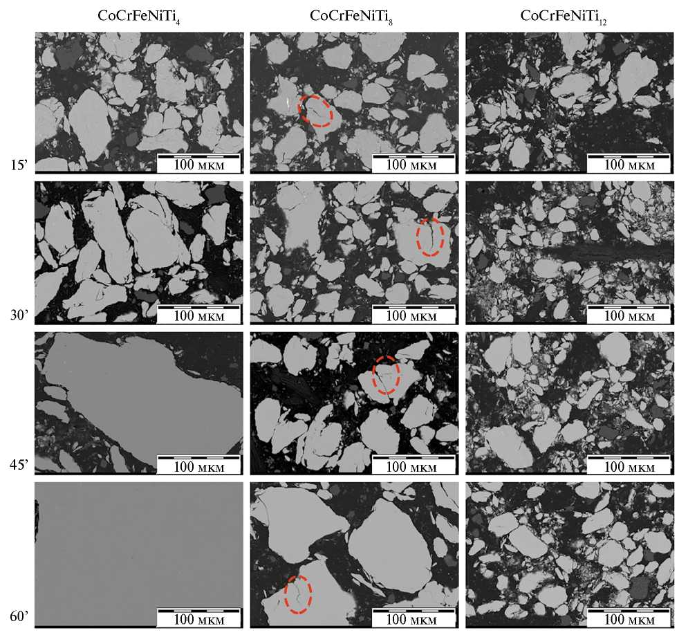 Серия порошковых композиций CoCrFeNiTi4, CoCrFeNiTi8 и CoCrFeNiTi12 была изготовлена путем МЛ исходных порошков (табл. 1) в течение 15, 30, 45, 60 мин. Эволюция микроструктуры частиц порошков показана на рис. 1. За счет интенсивной пластической деформации и слипания исходных порошков частицы смеси CoCrFeNiTi4 значительно увеличились в размере: после 60 мин обработки наряду с мелкими частицами были обнаружены крупные агломераты размером до 600 мкм. Средний диаметр частиц после 15 и 60 мин. МЛ составлял 16 и 43 мкм соответственно. В композиции CoCrFeNiTi8 средний диаметр частиц после 15 мин. МЛ составлял 14 мкм. МЛ в течение 30 мин вызвало незначительный рост размеров частиц порошка, тогда как МЛ в течение 60 мин приводило к увеличению их средних размеров до 28 мкм. В смеси CoCrFeNiTi12 средний размер частиц порошка, составлявший после 15 мин. МЛ 13 мкм, оставался практически неизменным после 45 мин. МЛ и увеличился до 17 мкм после 60 мин МЛ. Крупные частицы порошка в смесях, CoCrFeNiTi4 и CoCrFeNiTi8 имели трещины (рис. 1).