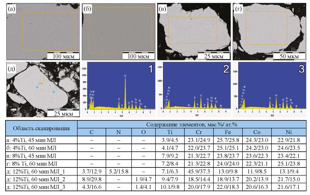 Результаты МРСА, полученные с поверхности шлифа частиц порошков CoCrFeNiTi4 и CoCrFeNiTi8 после 45 и 60 мин МЛ, показали, что химический состав частиц с учетом точности МРСА соответствует составу исходной смеси, что является подтверждением высокой однородности структуры этих порошков. Единичные включения в образце CoCrFeNiTi12 были обогащены углеродом, кислородом и азотом (рис. 3).