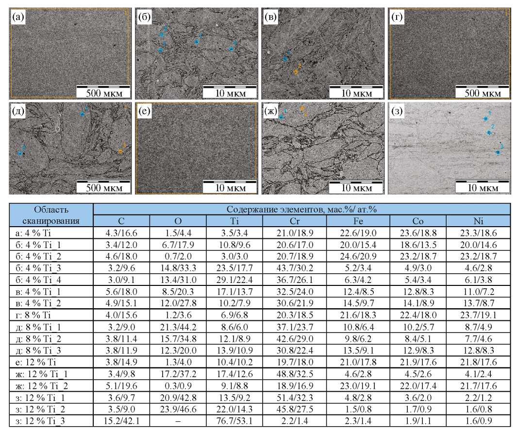 Титан является перспективным легирующим элементом, образующим дисперсные фазы в ВЭС на основе системы Co–Cr–Fe–Ni. Механизм положительного влияния Ti на свойства ВЭС Co–Cr–Fe–Ni связывают с твердорастворным и дисперсионным упрочнением матрицы. Исследования интерметаллических фаз, образующихся при избытке Ti, имеющего ограниченную растворимость в твердом ГЦК-растворе, продемонстрировали эффективность дисперсионного твердения как метода упрочнения ВЭС, который, однако, может привести к значительной хрупкости. Поэтому достижение высокой прочности и сохранение пластичности в таких ВЭС по-прежнему остается сложной задачей [1, 30].