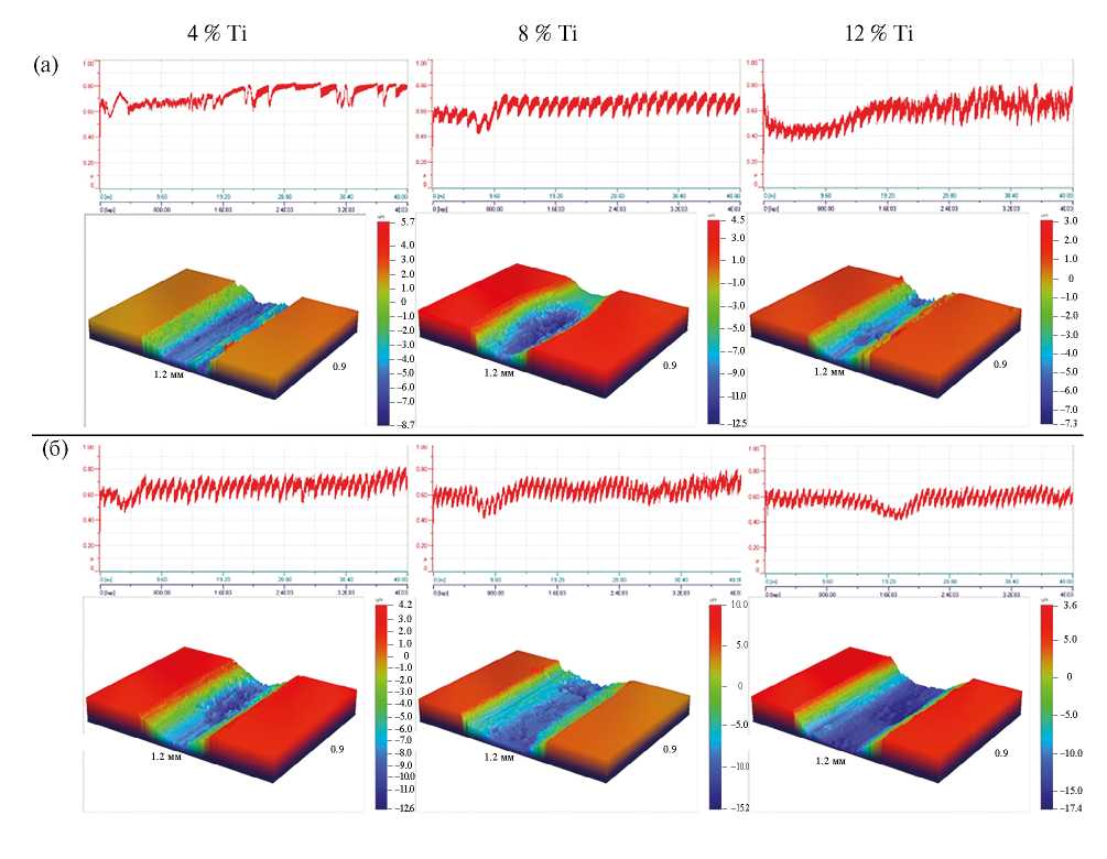 Зависимости коэффициента трения от пробега указывают на то, что образцы характеризуются нестабильным коэффициентом трения (табл. 5, рис. 11). Это, вероятно, связано с выкрашиванием отдельных частиц оксинитридных включений, содержащихся в структуре образцов, что можно наблюдать на 2D- и 3D-изображениях профилей дорожек износа (рис. 11б).