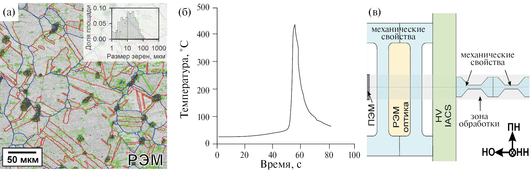 В качестве материала исследования был выбран медный сплав Cu–0.3%Cr–0.5%Zr (вес.%). Пластины из сплава размером 70 мм×90 мм×3 мм были обработаны на пересыщенный твердый раствор (далее закалка) с выдержкой при температуре 920°С в течение 1 ч и охлаждением в воде. Твердость и электропроводность образцов после закалки составляла 70 HV и 20 МСм/м соответственно, размер зерен достигал 20–30 мкм (рис. 1а), плотность дислокаций ~1013 м-2. ОТП проводили на установке AccuStir 1004 фирмы General Tool Company с использованием инструмента из карбида вольфрама, диаметр плоских плечиков которого составлял 12 мм, а диаметр сферического пина — 5 мм. Угол наклона инструмента к поверхности пластины — 2.5°, среднее осевое усилие в процессе сварки — 13 кН. Скорость вращения достигала 800 мин-1, скорость подачи — 375 мм/мин. Скорость вращения и скорость подачи были подобраны таким образом, чтобы в процессе ОТП в зоне перемешивания обеспечить температуру близкую к температуре старения Cu–Cr–Zr-сплава при максимально высокой скорости охлаждения. В ходе ОТП проводили измерения температуры процесса на границе зоны перемешивания и зоны термического влияния с помощью термопар К-типа. Как видно из рис. 1б, максимальная температура деформации в процессе ОТП составляет около 440°С, что соответствует температуре старения Cu–Cr–Zr-сплава. После ОТП осуществляли старение при температуре 450°С в течение 1 ч с охлаждением в воде.