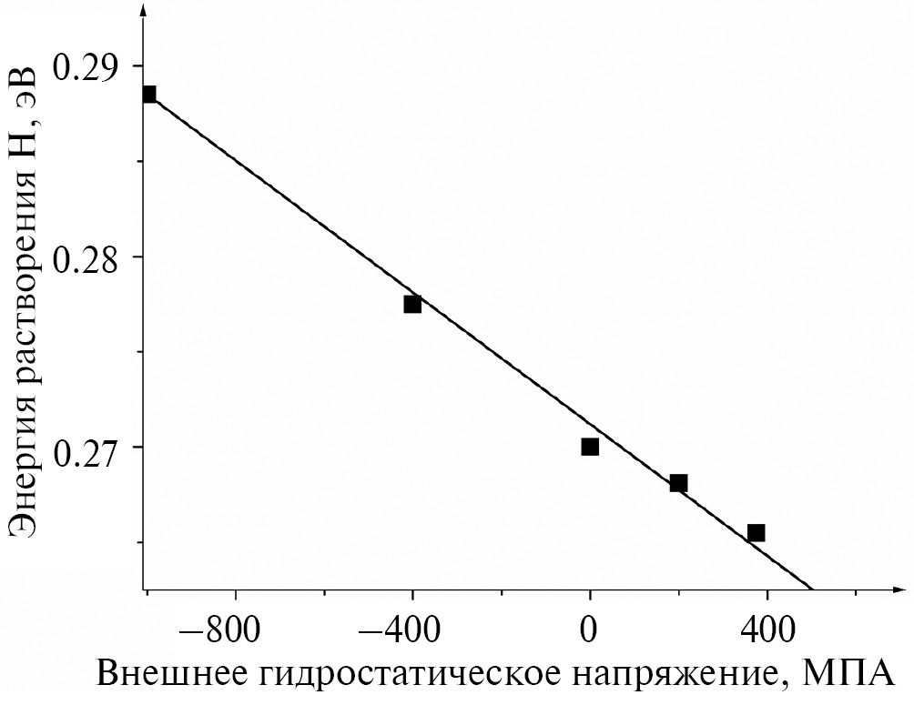 Отметим, что энергия растворения наименьшая для ГЦК-Fe и наибольшая для ОЦК-Fe. Наличие деформации решетки существенно изменяет растворимость H. Энергия растворения H в феррите значительно снижается при изменении параметра решетки под действием приложенного гидростатического напряжения (рис. 3).