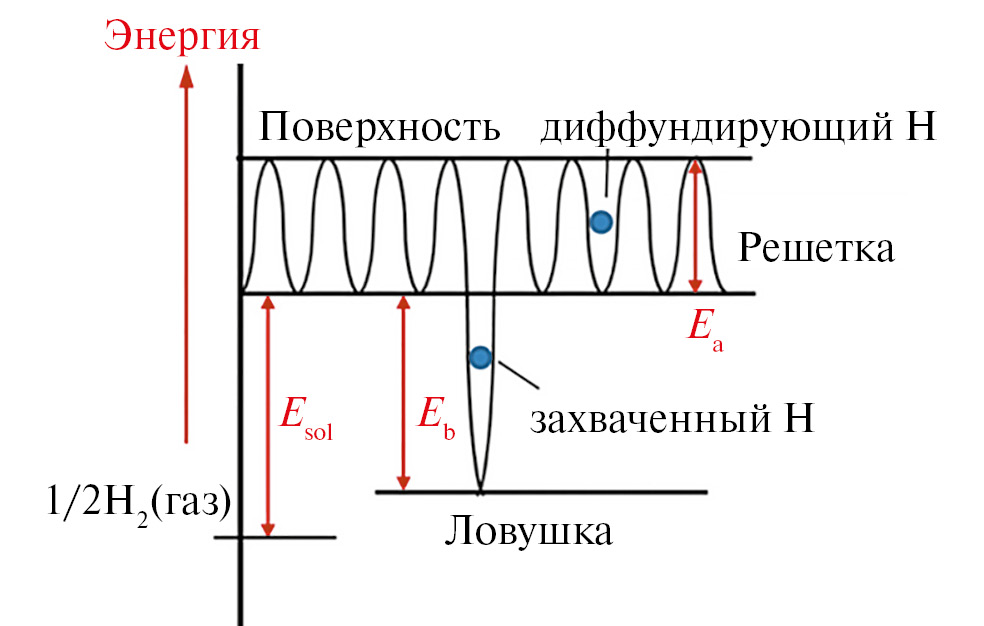 В контексте водородного охрупчивания, глубокой мы считаем ловушку, в которой захваченный водород не способен вернуться в решетку и стать диффузионно-подвижным в течение значительного времени. При таком подходе способ задания “глубины” ловушек в виде указания границы энергии их связи, которая отличает обратимые ловушки от необратимых, становится неопределенным. Действительно, задание определенной границы энергии захвата не учитывает временной и температурный фактор.