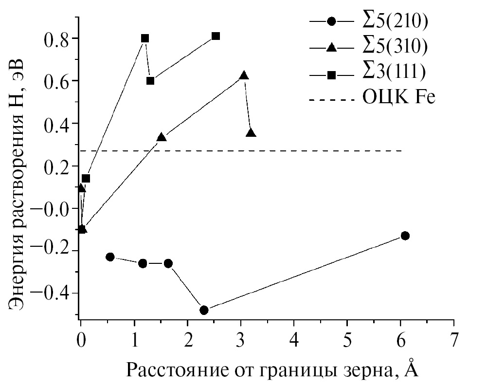 Взаимодействие с границами зерен. В соответствии с моделью декогезии, усиленной водородом (HEDE), присутствие водорода может ослабить связи атомов железа на границах зерен, что приведет к межзеренному охрупчиванию и, следовательно, к разрушению объемного материала. Были выбраны три границы зерен наклона Σ3(111), Σ5(210) и Σ5(310). Граница Σ3(111) является наиболее часто изучаемой и может рассматриваться в качестве модельной системы. Граница Σ5(310) имеет низкую энергию формирования в ОЦК-железе. Граница Σ5(210) менее изучена, но интересна из-за взаимного сдвига одного зерна относительно другого, который создает асимметрию в системе. Поэтому ее можно использовать как модель для асимметричных границ наклона в железе. На рис. 7 представлены расчетные значения энергии растворения водорода как функции расстояния от границы раздела зерен для трех исследованных границ [31]. Разность между энергиями растворения вблизи границы и в тетрапорах ОЦК-Fe (показана на рис. 7 штриховой линией) определяет значение энергии захвата.