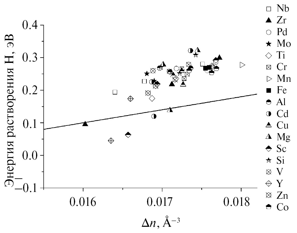 В теории эффективной среды энергию внедрения атомов H в металл принимают как энергию внедрения в гомогенный электронный газ плотности n0 — соответствующим образом взвешенное среднее значение электронной плотности в небольшой зоне вокруг протона, где возмущение, им создаваемое, велико [46]. Энергия внедрения атомов H монотонно убывает с уменьшением плотности электронов, пока не достигнет минимума при оптимальной плотности n0 =0.012 e/Å3 (прямая линия на рис. 9, взята из работы [46]). Можно принять, что изменение электронной плотности Δn в тетрапоре железа при помещении туда атома водорода примерно соответствует параметру n0. Сравнение наших результатов и данных [46] полностью подтверждает данное предположение. Поскольку плотность электронов вблизи ионов Fe намного выше, чем n0, то водород растворяется там, где плотность электронов самая низкая — в тетрапоре с плотностью n0 ≈ 0.018 e/Å3. Введение примесей приводит к изменению плотности электронов в тетрапорах окружения, что и приводит к изменению энергии растворения.