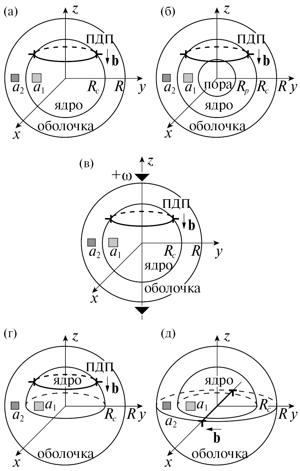 Рис. 1. Модели дислокаций несоответствия в сферических наногетероструктурах типа “ядро–оболочка”: в сплошной (а) и полой (б) монокристаллических наночастицах, в декаэдрической наночастице (в) и в наночастице с полусферическим ядром (г, д). На схемах (а–г) показаны круговые призматические дислокационные петли (ПДП), на схеме (д) — прямолинейная краевая дислокация. Здесь a1 и a2 — параметры решеток материалов ядра и оболочки; Rp, Rc и R — радиусы поры, ядра и оболочки; b — вектор Бюргерса дислокаций; ω — величина вектора Франка клиновой дисклинации, моделирующей напряженное состояние в декаэдрической частице; (x, y, z) — декартова система координат.