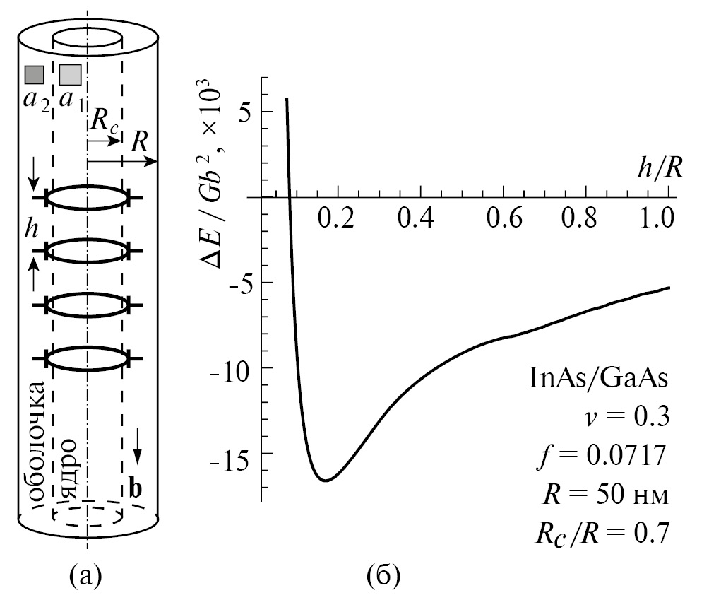 Так для композитной нанопроволоки типа “ядро–оболочка” была найдена равновесная плотность бесконечного периодического ряда петель ДН (рис. 3) [41], которая хорошо совпадает с результатами прямых экспериментальных наблюдений [58]. В частности, для нанопроволоки InAs–GaAs диаметром 100 нм с толщиной оболочки 15 нм и решеточным несоответствием 6.67–7.17% расчетные значения равновесного расстояния между петлями ДН составили 8.35-9.05 нм [41], а в эксперименте наблюдали расстояния 7.0-8.5 нм [58]. При этом показано, что образование равновесного ансамбля петель ДН в такой нанопроволоке приводит к понижению ее полной энергии на 31%.