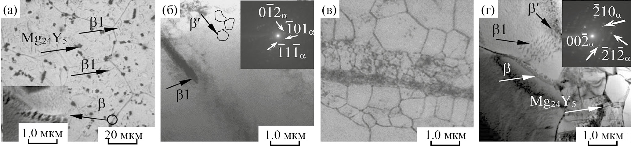 Изображения микроструктуры сплава Mg–2.9Y–1.3Nd в КК- и УМЗ-состояниях представлены на рис. 3. Сплав Mg–2.9Y–1.3Nd в КК-состоянии состоит из основной матричной фазы α-Mg (ГПУ-решетка) и четырех типов включений: интерметаллидных частиц Mg24Y5 (ОЦК-решетка), метастабильных выделений bʹ-фазы (Mg12NdY, орторомбическая решетка), b1-фазы (Mg3NdY, ГЦК-решетка) и равновесной b-фазы (Mg14Nd2Y, ГЦК-решетка), рис. 3а, 3б.