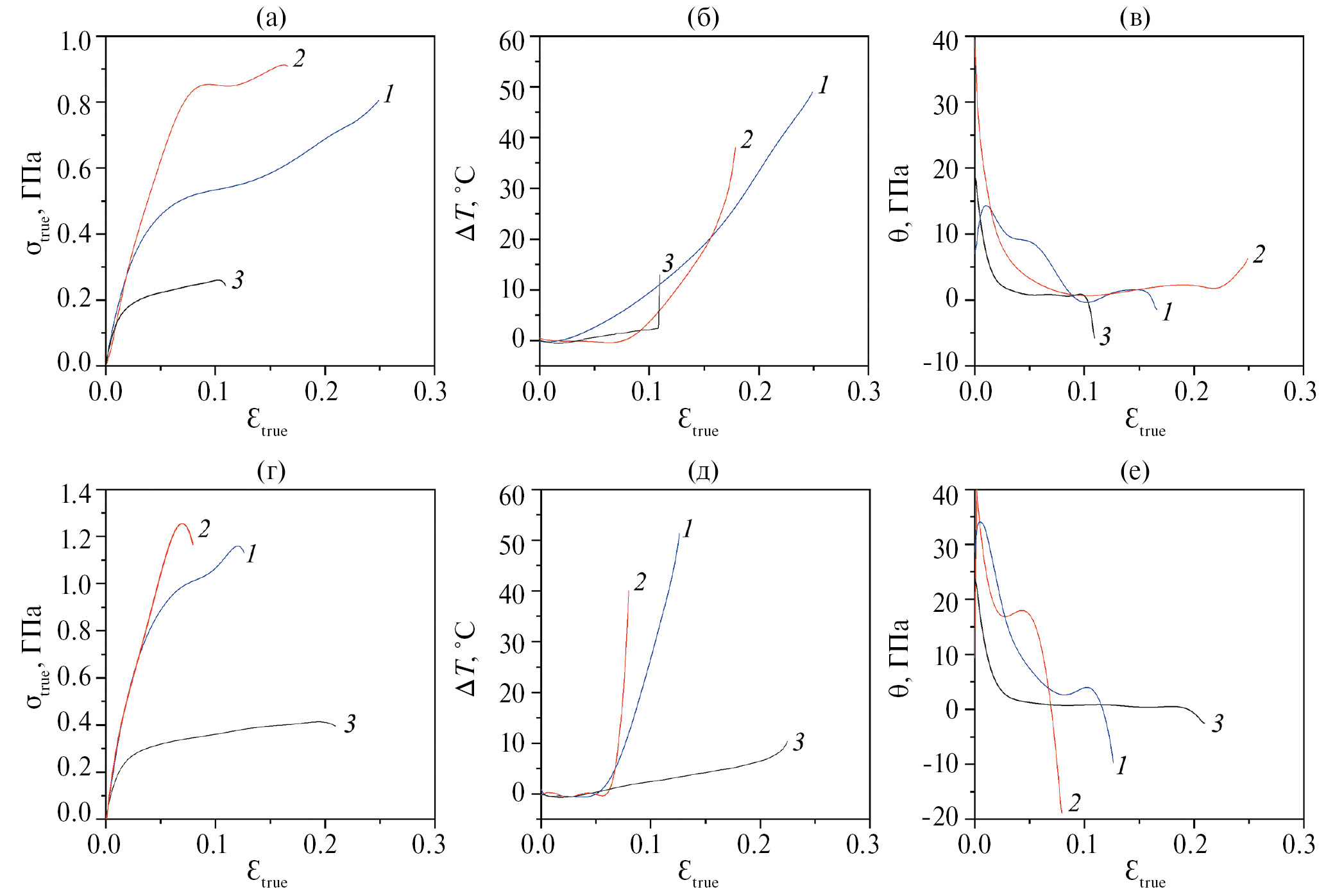 На рис. 4 приведены истинные деформационные (рис. 4а, 4г), температурные кривые (рис. 4б, 4д) и зависимости коэффициента деформационного упрочнения (рис. 4в, 4е) для образцов титана ВТ1-0 (кривые 1), сплавов Ti-45Nb (кривые 2) и Mg–2.9Y–1.3Nd (кривые 3) в КК-(рис. 4а-4в) и УМЗ (рис. 4г-4е) состояниях. На кривых strue(etrue) для исследуемых сплавов в области образования “шейки” имеет место значительный рост истинного напряжения течения (рис. 4а). При этом кривая strue(etrue) для титана ВТ1-0 в КК-состоянии имеет восходящую параболическую ветвь (рис. 4а), а кривая strue(q) — ниспадающую ветвь с коэффициентом q, равным 5 ГПа (рис. 4в).