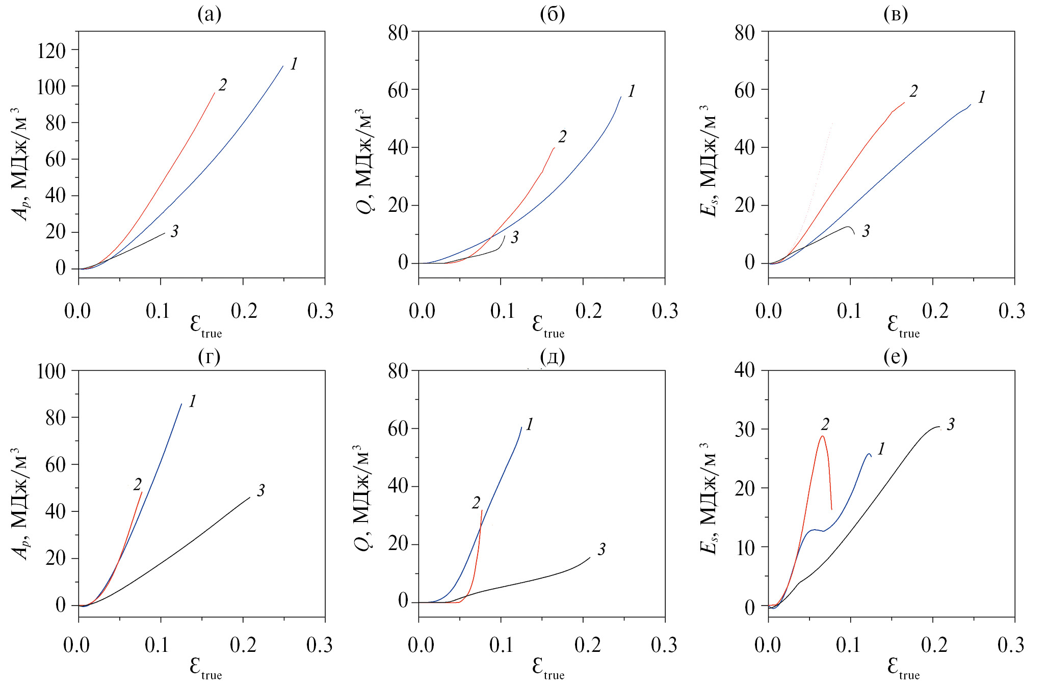 Рис. 5. Зависимости энергий при деформировании от истинной деформации для образцов титана ВТ1-0 (кривые 1), сплавов Ti–45Nb (кривые 2) и Mg–2.9Y–1.3Nd (кривые 3) в КК- (а–в) и УМЗ- (г–е) состояниях: а, г — удельная работа пластической деформации (Аp); б, д — удельное количество теплоты, выделившееся при деформировании (Q); в, е — поглощенная энергия при деформировании (Es).