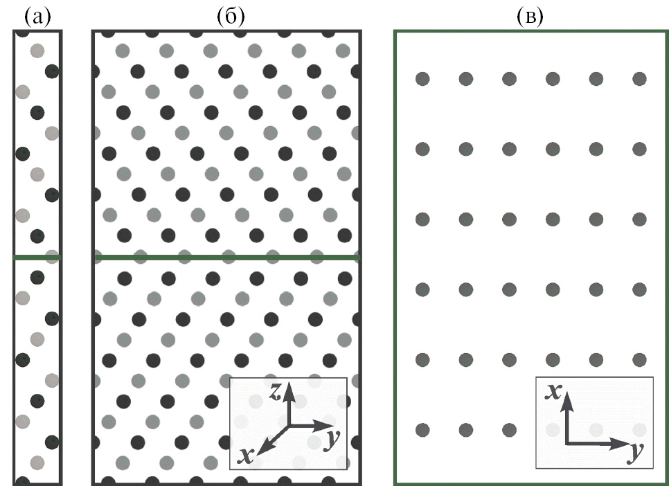 Рис. 1. Атомистические модели прилегающих друг к другу кристаллитов, образующих ГЗ S3(112): а — базовая модельная ячейка; б — модельная расчетная область, полученная путем трансляции модельной ячейки в направлениях х и y; в — атомы в плоскости ГЗ, образующие РСУ.