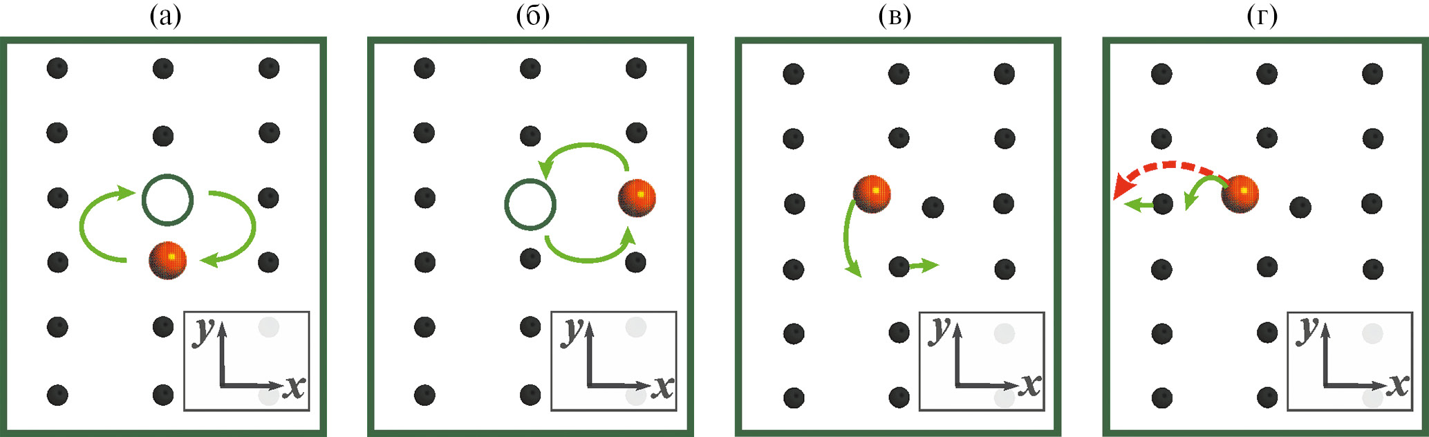 Рис. 3. Схематическое изображение индивидуальных прыжков атомов примеси, обуславливающих: а — вакансионный тип диффузии в y-направлении; б — вакансионный тип диффузии в x-направлении; в — междоузельный тип диффузии в y-направлении; г — междоузельный тип диффузии в x-направлении.