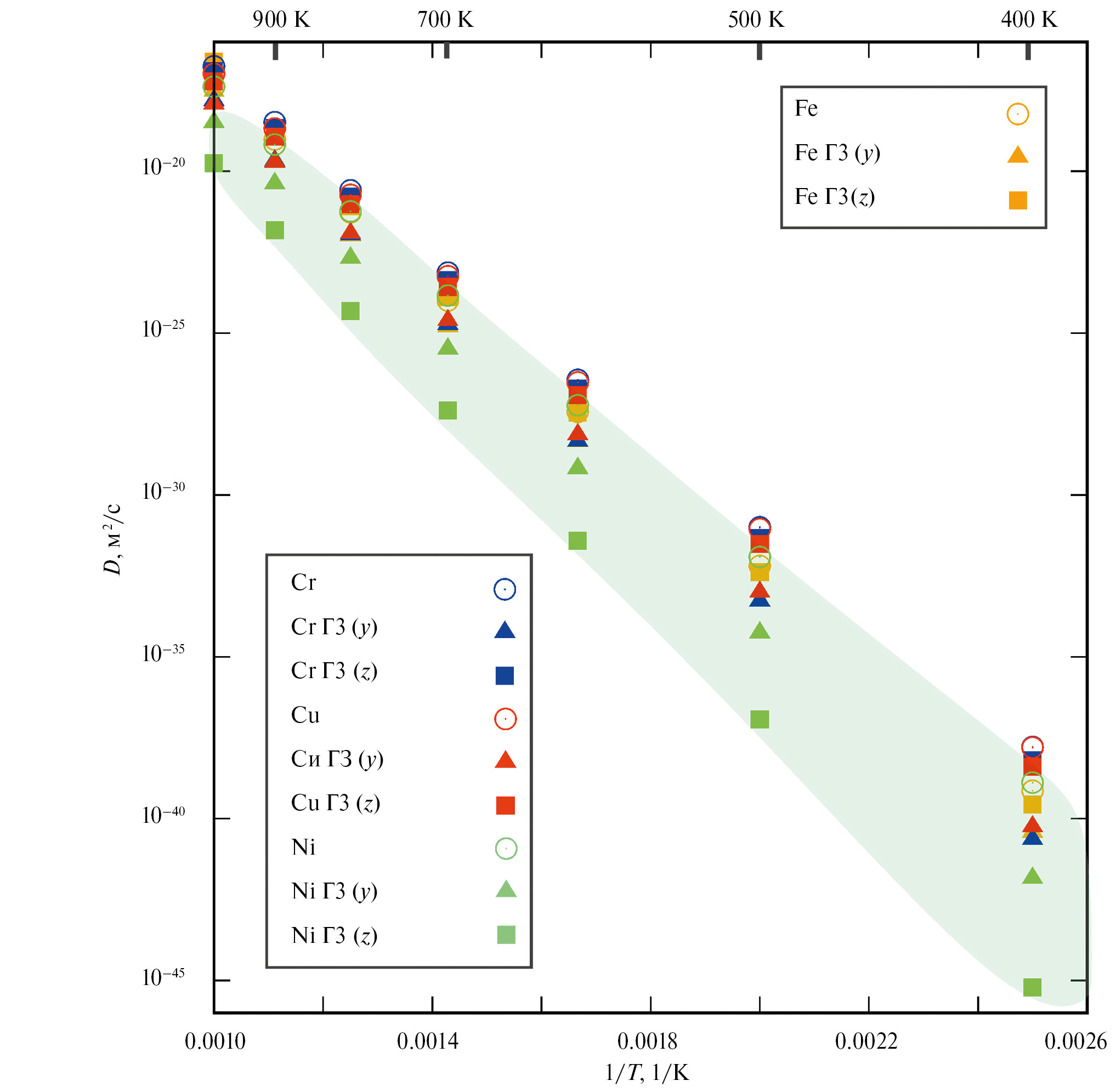 Семейство представленных на рис. 4 зависимостей коэффициентов диффузии от обратной температуры позволяет сделать вывод о скоростях диффузионных процессов собственных и примесных атомов (Cr, Ni и Cu) в объеме ОЦК-железа и на ГЗ S3(112). Круглые, треугольные и квадратные метки соотносятся, соответственно, с коэффициентами диффузии в объеме, в y-направлении на ГЗ S3(112) и в z-направлении на ГЗ S3(112). Метки, относящиеся к диффузии одной и той же частицы в объеме ОЦК-железа и на ГЗ S3(112), окрашены в одинаковый цвет. По разбросу меток желтого цвета вдоль вертикальной координаты можно судить о невысокой степени анизотропии коэффициентов диффузии, относящихся к переносу собственных атомов железа в объеме и на ГЗ S3(112) в y- и в z-направлениях. В диапазоне температур от 400 до 1000 К коэффициенты самодиффузии отличаются менее чем на один порядок, что соотносится с типичным значением погрешностей при построении атомистических DFT-моделей диффузии.