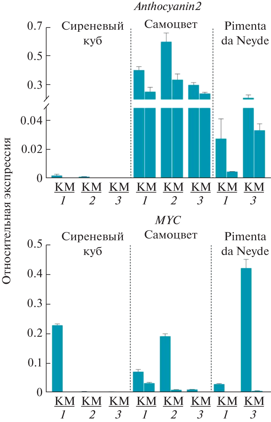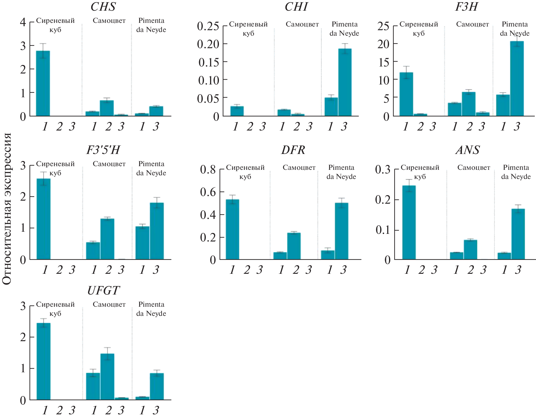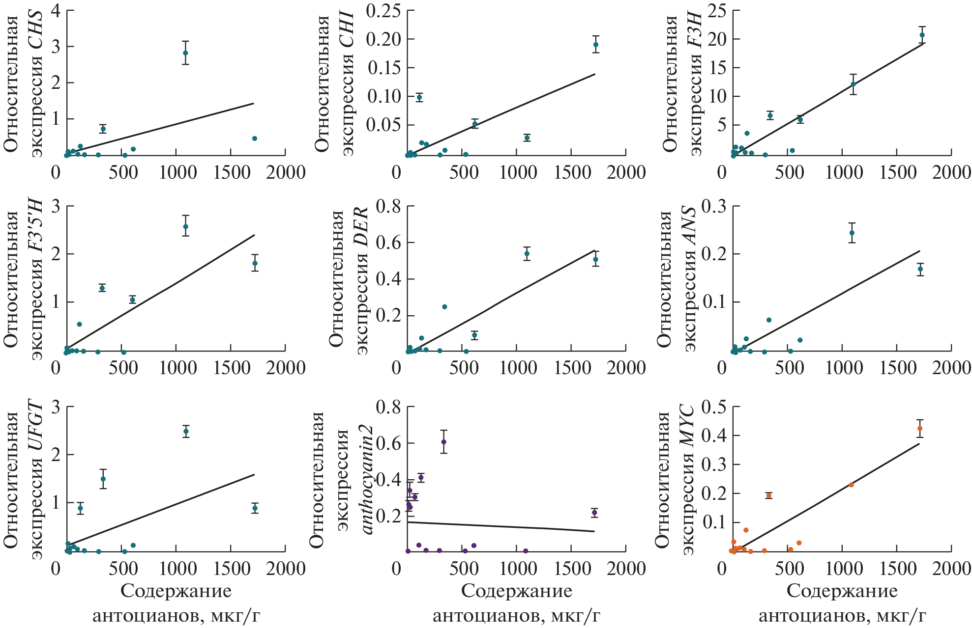 In fruits of cultivars of pepper species Capsicum annuum (Sirenevyi Cub), C. frutescens (Samotsvet) and C. chinense (Pimenta da Neyde), which differ in the pigmentation profile during maturation, the content of anthocyanins and the expression pattern of the structural and regulatory genes of anthocyanin biosynthesis were determined. Anthocyanins were found in the fruit of the Sirenevyi Cub cultivar as well as in the peel and pulp of Samotsvet and Pimenta da Neyde cultivars. In the peel of the fruits of all three analyzed cultivars, the levels of expression of structural genes for the biosynthesis of anthocyanins are two or more times higher than in the pulp. In cv. Samotsvet and Pimenta da Neyde, the expression in the pulp of CHS, F3´5´H, DFR, ANS, and UFGT are higher than that of cv. Sirenevyi Cub. The cv. Pimenta da Neyde is characterized by a high expression of structural genes in the pulp and peel of ripe fruit. Expression of transcription factor genes anthocyanin2 (R2R3-MYB) and MYC (bHLH) was detected in the peel of fruits of cv. Sirenevyi Cub as well as in the peel and pulp of fruits of cv. Samotsvet and Pimenta da Neyde at all the analyzed stages of ripening. For all structural genes of the anthocyanin biosynthesis pathway, a high correlation was found (r = 0.54‒0.93) between the expression levels of all anthocyanin biosynthesis structural genes and anthocyanin content in fruits. High correlation (r = 0.88) is also shown for MYC. For the anthocyanin2, correlation (r = 0.85) is present only for cv. Sirenevyi Cub and Pimenta da Neyde but not for cv. Samotsvet.