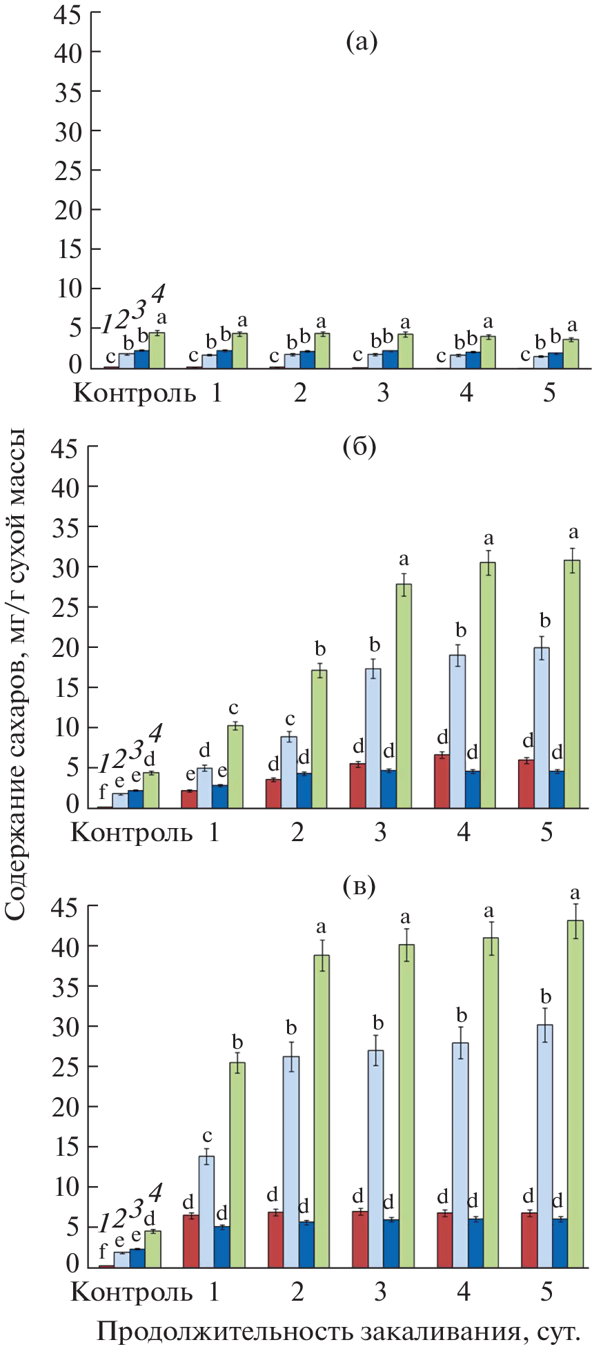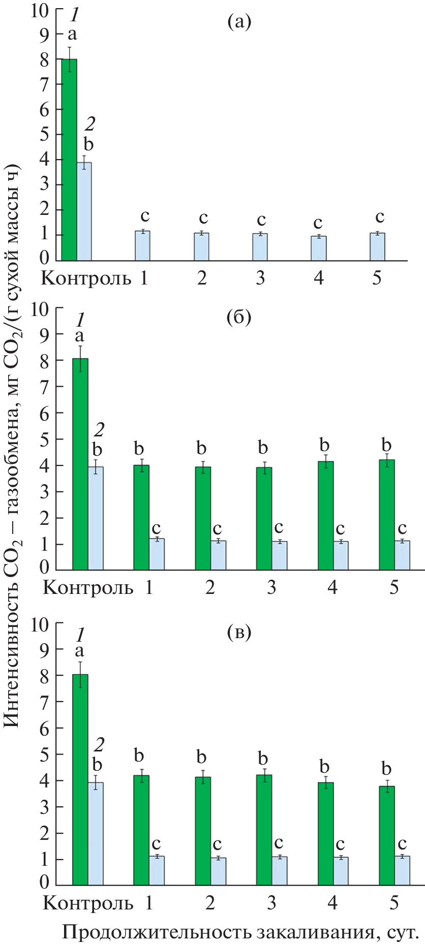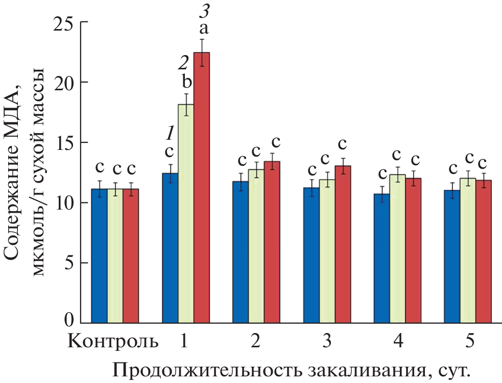 The effect of photoperiod duration on efficiency of low-temperature hardening was investigated in Arabidopsis thaliana (L.) Heynh. plants, ecotype Col-0. Six-week-old plants were exposed to cold acclimation at a temperature of 2°С during 1‒5 days at photoperiods of 0, 8, and 16 h (illuminance of 200 µmol/(m2 s)). According to survival data and leakage of electrolytes after test freezing (–6°C, 24 h), the plants exposed to cold acclimation in the dark did not show frost resistance. The plants hardened in the light (irrespective of the length of photoperiod) considerably improved their frost resistance by the end of the cold-acclimation period. Net photosynthesis/dark respiration ratio in these plants was almost two times greater than in control material (without hardening). The plants exposed to a 16-h-long photoperiod surpassed the type of treatment with 8-h-long illumination both in the highest levels of accumulation of sugars (by almost 40%) and in the rate of reaching these levels in daily dynamics of hardening. It was shown that MDA content transiently rose during the first 24 h of hardening in the light and did not change in the dark, which may point to a signal role of lipid peroxidation products upon cold acclimation. It was discovered that the photoperiod duration affected the formation rate of frost resistance in A. thaliana plants. A more prolonged operation of A. thaliana’s photosynthetic apparatus at 16-h-long photoperiod considerably accelerated the accumulation of sugars upon cold acclimation and, therefore, hastened development of frost resistance as compared with an 8-h-long photoperiod. It was concluded that rapid formation of frost resistance in A. thaliana requires a combination of low above-zero temperature and 16-h-long photoperiod.