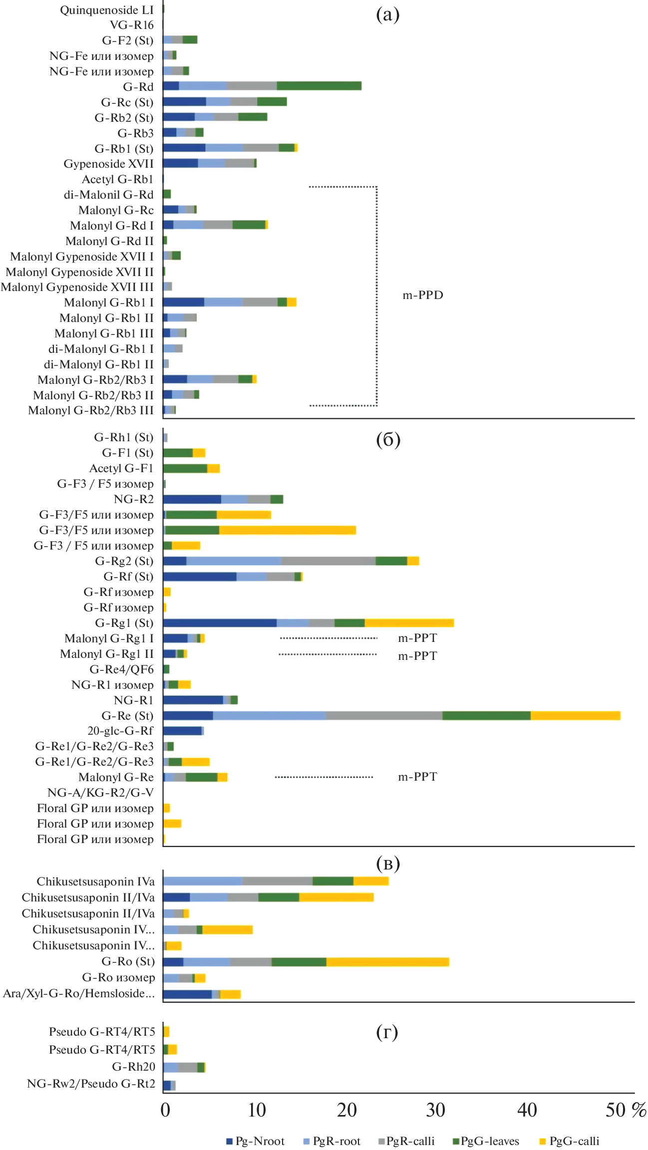 The composition of triterpene glycosides in different in vitro tissues of cell lines (PgR–rhizogenic and PgG–hemogenic) and roots of ginseng plants (Panax ginseng C.A. Meyer), grown on plantations in Primorsky Krai (Russian Federation) was determined using the HPLC-MS method. More than 60 triterpene glycosides have been detected and characterized. The maximum content of ginsenosides was identified in the leaves of the hemogenic line. The total amount of ginsenosides in the PgG line embryonic tissue was lower compared to all other samples studied mainly due to the amount of protopanaxadiols. In all parts of the PgR line, the content of protopanaxatriol Re was two times higher than in the root of the intact plant. A high content of protopanaxatriols and oleanolic ginsenosides was found in the basal parts of PgR and PgG calli. Thus, morphogenic cell lines not only repeated the pattern of qualitative ginsenosides composition in comparison with individual parts of native roots and leaves but also demonstrated an increase in their diversity and quantity.
