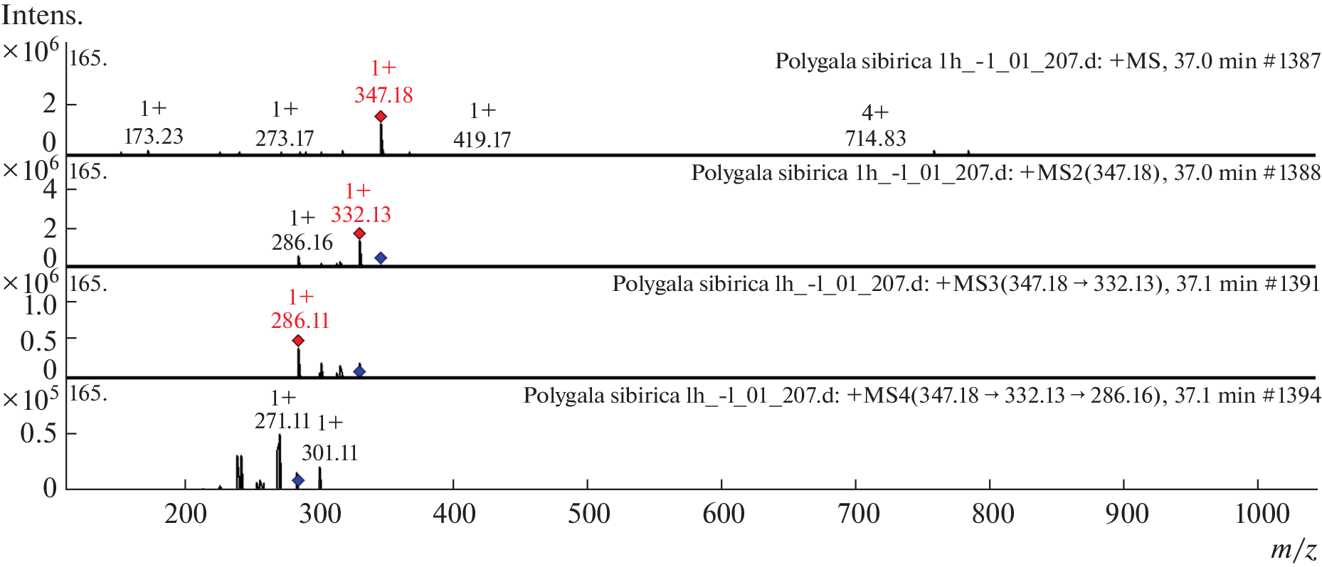 - Geng P., Sun J., Zhang M., Li X., Harnly J. M., Chen P. Comprehensive characterization of C-°glycosyl flavones in wheat (Triticum aestivum L.) germ using UPLC°-PDA°-ESI/HRMSn and mass defect filtering // J. Mass Spectrom. 2016, V. 51(10). P. 914. https://doi.org/10.1002/jms.3803