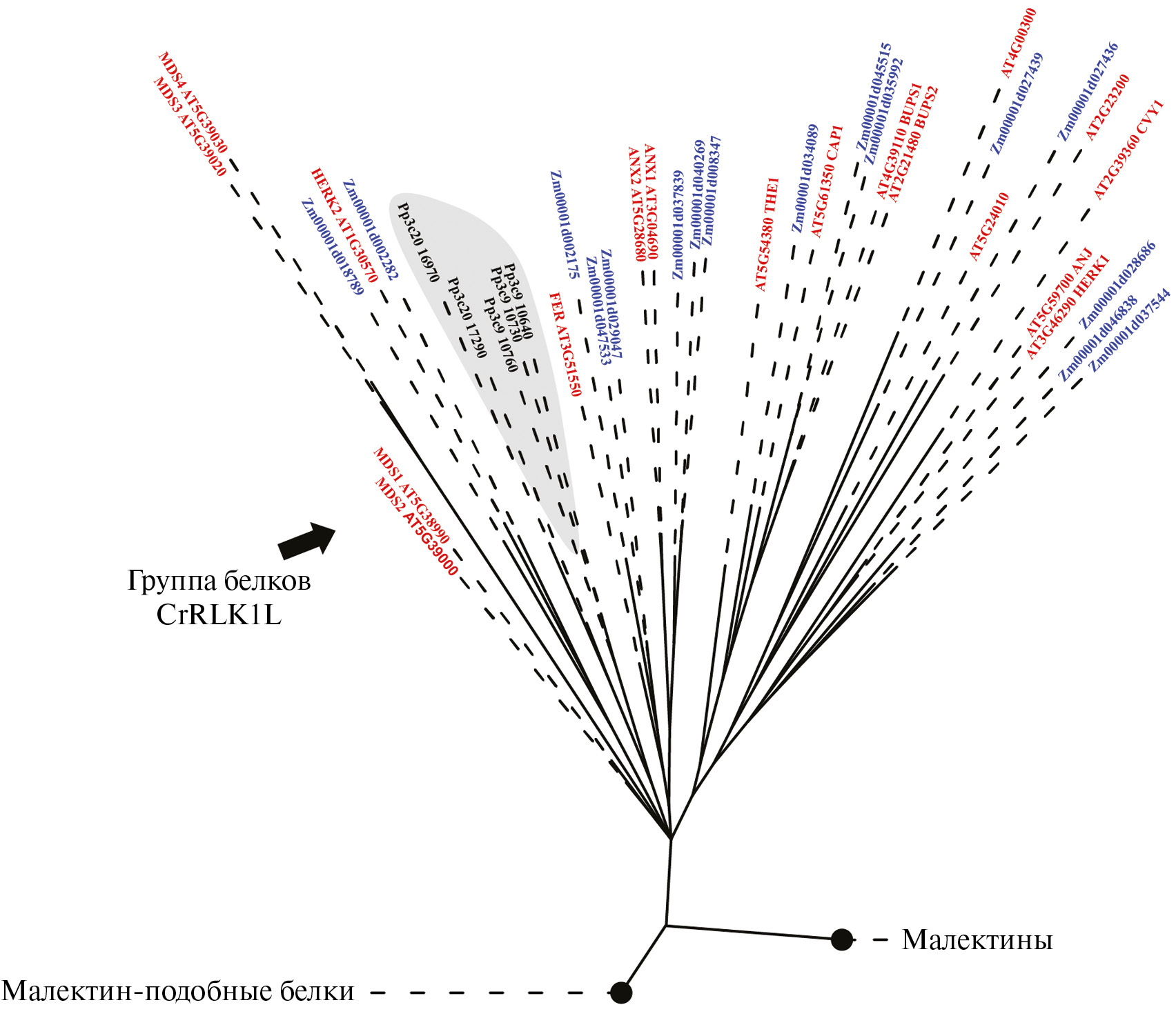 Рис. 3. Клада филогенетического древа белков группы CrRLK1L семейства малектин-подобных белков мха P. patens, кукурузы (Z. mays) и A. thaliana. Для удобства визуализации другие клады малектин-подобных белков и малектинов были удалены, полное древо представлено в Дополнительных материалах, рис. 1. Дистанция Робинсона-Фулдса для данного древа была равна 0. Из древа были удалены точки ветвления с уровнем поддержки ниже 90. Серым цветом дополнительно выделены клады, содержащие белки мха.
