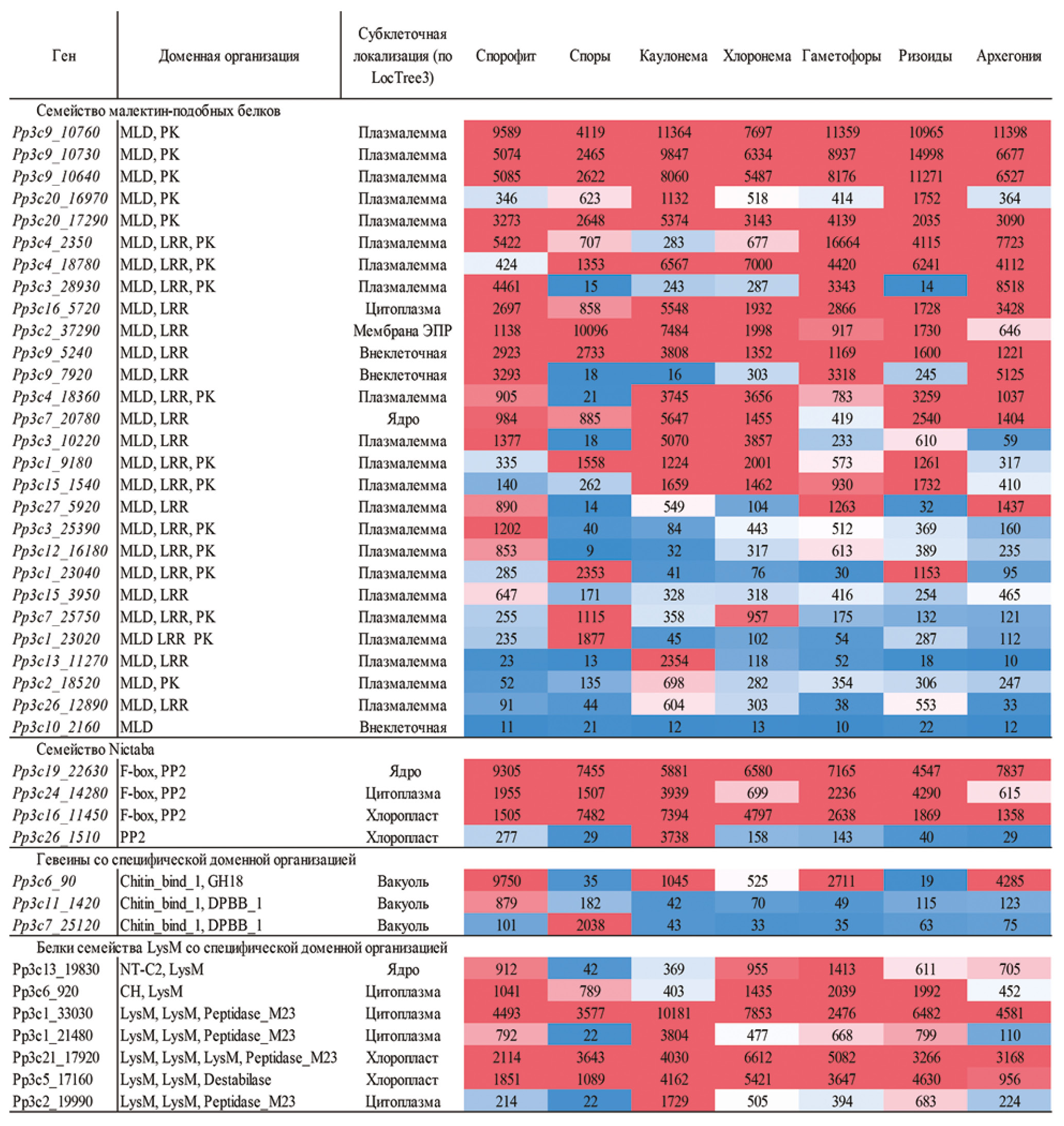 Рис. 4. Экспрессия генов мха P. patens, кодирующих белки семейств малектин-подобных белков и Nictaba, а также отдельных представителей семейств гевеинов и LysM со специфической доменной организацией. Представлена их экспрессия в различных типах тканей P. patens (по данным [27]). Для спорофита указано среднее значение экспрессии для всех стадий развития спорофита. Приведена доменная организация и предсказанная in silico субклеточная локализация белков.