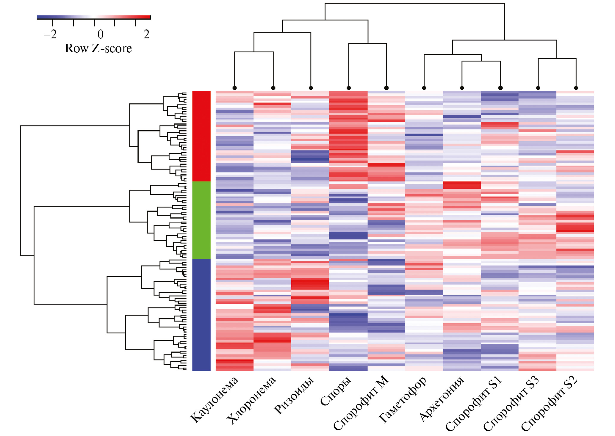 Рис. 5. Результаты иерархического кластерного анализа и тепловая карта уровней экспрессии генов, кодирующих белки с лектиновыми доменами в различных типах тканей мха P. patens. Тепловая карта отражает относительный уровень экспрессии каждого гена (строки) в каждом образце (ряды). Уровень экспрессии в кластерах представлен в виде трансформированного в Z-score логарифмированного значения экспрессии (цветовая шкала в верхнем левом углу рисунка). Три выявленных кластера отображены в левой части в виде вертикальных прямоугольников (красный, зеленый, синий).