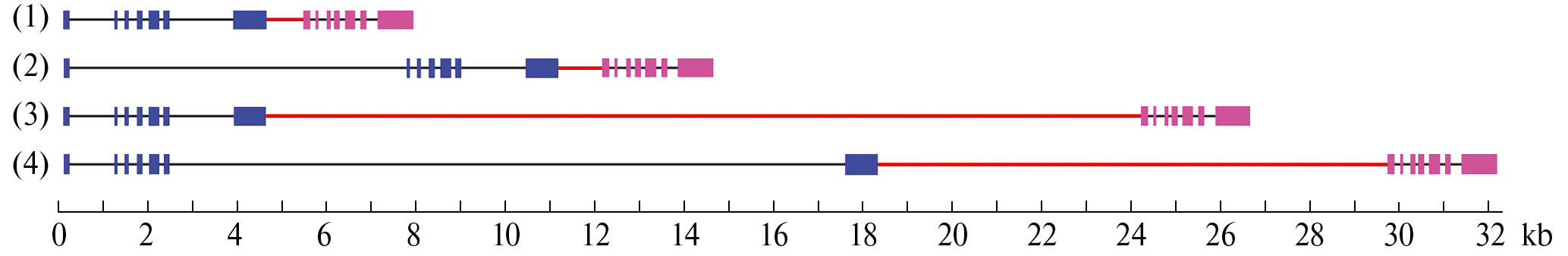 Рис. 1. Варианты (1–4) фрагмента ZmMDHAR3–ZmMDHAR5 на хромосоме 5 в геноме 35 образцов кукурузы, включая экзон-интронную структуру генов ZmMDHAR3 (экзоны обозначены синими блоками) и ZmMDHAR5 (экзоны обозначены розовыми блоками); красной линией обозначен межгенный спейсер.