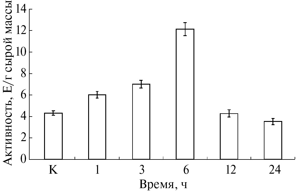 Результаты исследования активности ПЯКДГ в листьях пшеницы при солевом стрессе указывают на увеличение анализируемого показателя сразу после третьего часа инкубации в солевом растворе, достигая максимума на 6 ч и составляя 12.15 E/г сырой массы (рис. 1). Это значение превышает контрольное в 2.82 раза. Затем активность снижалась, приближаясь к уровню в контрольных образцах (рис. 1), достигая величины 3.85 Е/г сырой массы на 24 ч эксперимента.