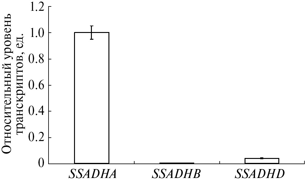 Результаты анализа относительных уровней транскриптов гомеологичных генов SSADH в листьях пшеницы показали, что в нормальных условиях основной вклад в общий уровень экспрессии вносит ген SSADHА. Ген SSADHB практически не экспрессируется в норме. Относительный уровень экспрессии гена SSADHD в 23.9 раз ниже такового для SSADHА (рис. 2).