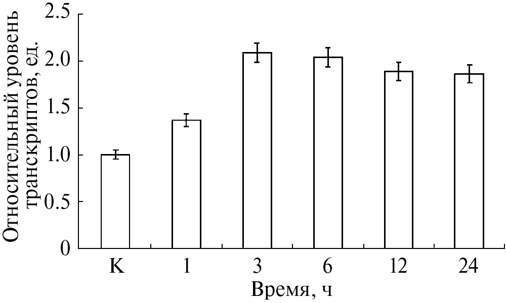 В связи с этим проанализировано изменение экспрессии гена WRKY3 и установлено увеличение содержания его мРНК в листьях пшеницы при засолении. Максимальное содержание транскриптов наблюдалось на 3 ч инкубации, превышая контрольные значения в 2 раза (рис. 5), что соотносится с высокой транскрипционной активностью гена SSADHA в этот период эксперимента. На протяжении дальнейшего времени экспозиции обнаружено незначительное снижение экспрессии гена WRKY3 в листьях пшеницы.