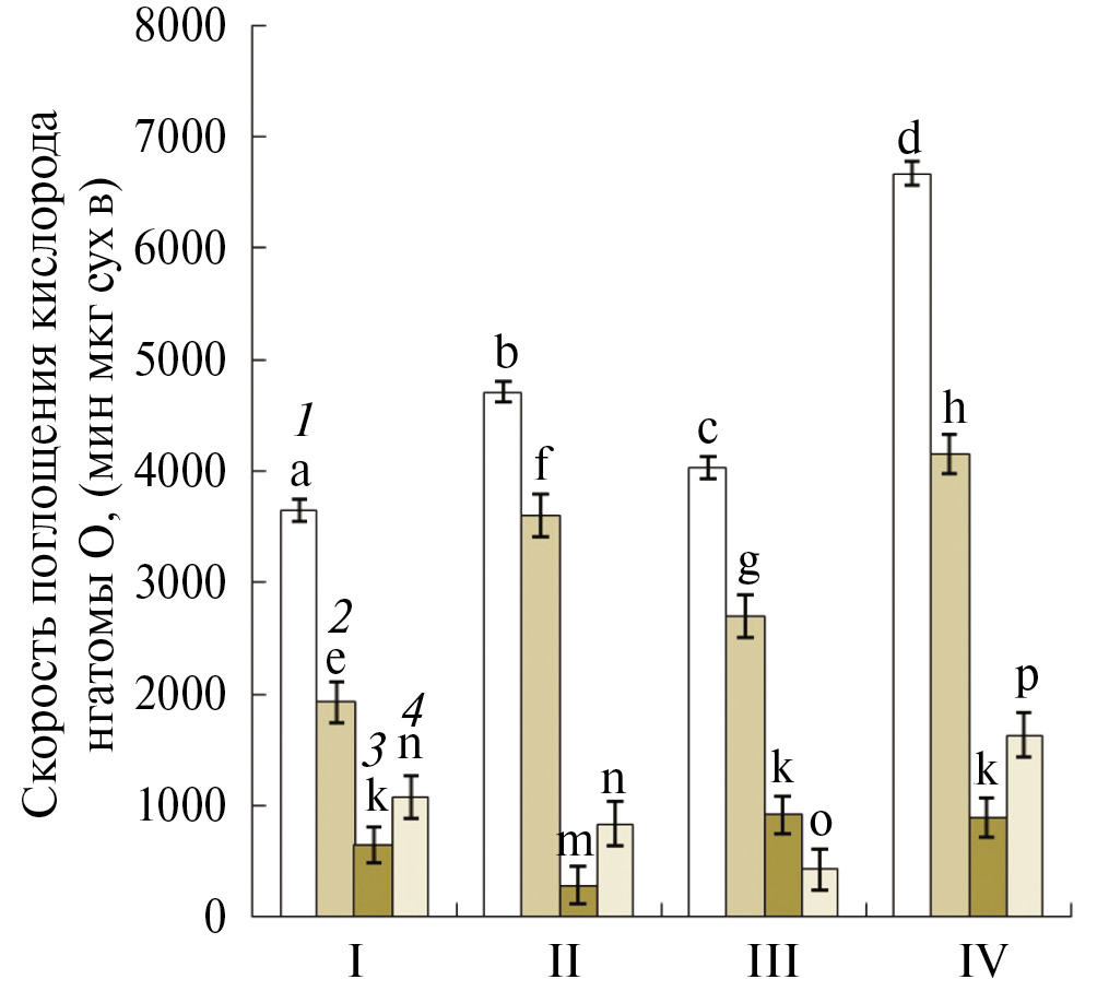 Рис. 6. Влияние обезвоживания и обработки мелатонином на дыхание и активность различных путей окисления малата (а) и сукцината (б) митохондриями эпикотилей 5-дневных проростков гороха: (1) – скорость окисления субстратов в состоянии 3 (V3); (2) – скорость окисления субстратов по цитохромному пути (Vцит); (3) – скорость окисления субстратов по альтернативному пути (Vальт); (4) – скорость остаточного дыхания (Vост). Варианты опытов: I – контрольные семена, II–семена после обработки мелатонином, III – семена после обезвоживания, IV – семена после обезвоживания и обработки мелатонином. На рисунках представлены средние арифметические значения и их стандартные ошибки. Статистически значимые различия между средними значениями опытных и контрольных образцов определяли с помощью Tukey тестa в программе ANOVA, результаты, относящиеся к соответствующему субстрату (1 или 2), отмеченные разными буквами, статистически значимы при Р ≤ 0.05.
