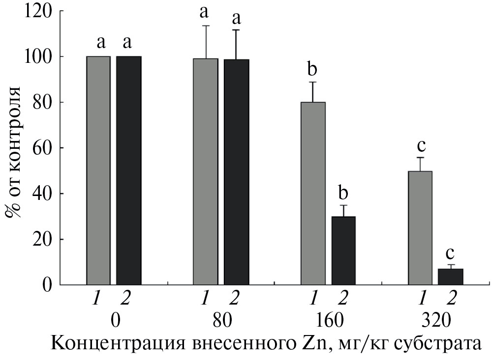 На момент окончания эксперимента не было обнаружено статистически значимых различий в аккумуляции сухой биомассы одного растения между сеянцами вариантов 80 мг Zn и контрольного (рис. 2). В присутствии 160 мг Zn темпы ее накопления у нормально развитых особей этого варианта также статистически значимо не отличались от контроля, угнетение аккумуляции биомассы у таких растений проявлялось лишь на фоне концентрации 320 мг.