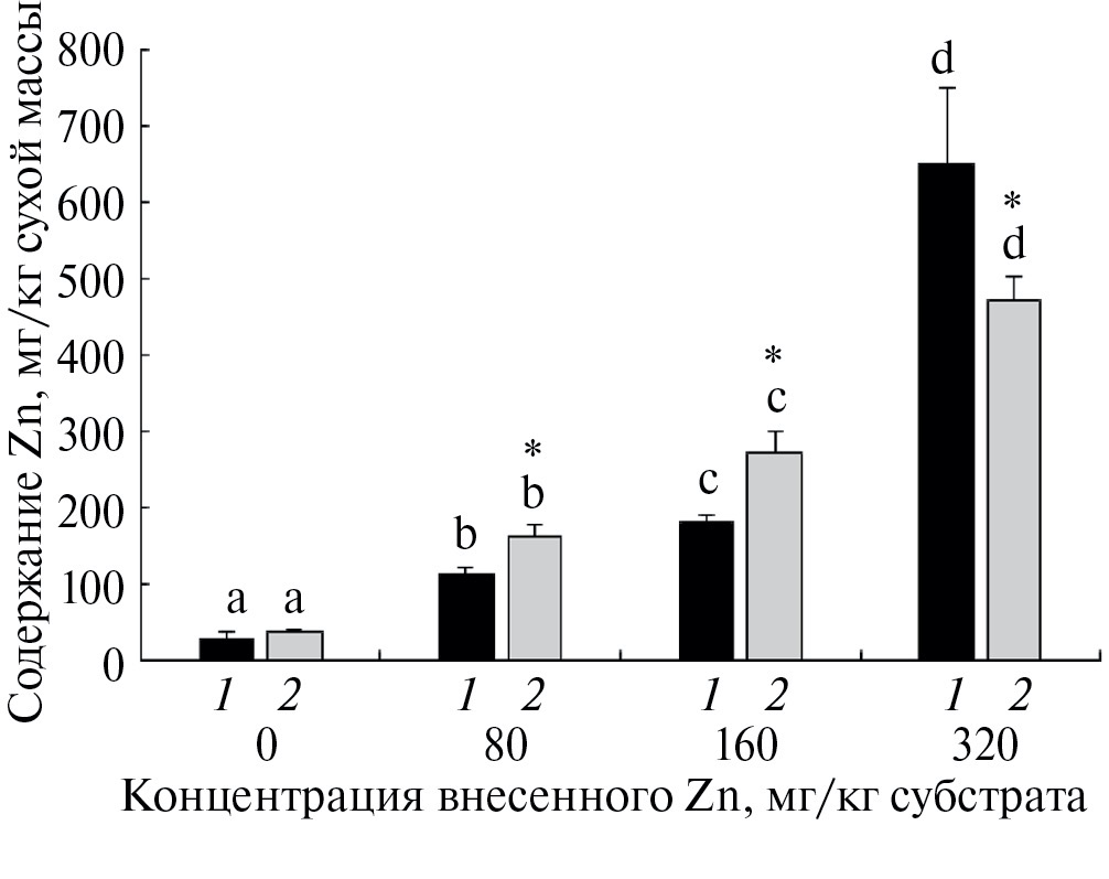 Рис. 4. Содержание Zn в корнях (1) и листьях (2) сеянцев Sisymbrium lypskyi после 2-месячного произрастания при разных уровнях Zn в субстрате. Обозначения статистической значимости различий приводятся отдельно для корней и листьев. Звездочкой обозначены статистически значимые различия между корнями и листьями для каждого из вариантов опыта. Приведены данные для нормально развитых растений. Разными буквами обозначены значимые различия между вариантами опыта при P < 0.05.