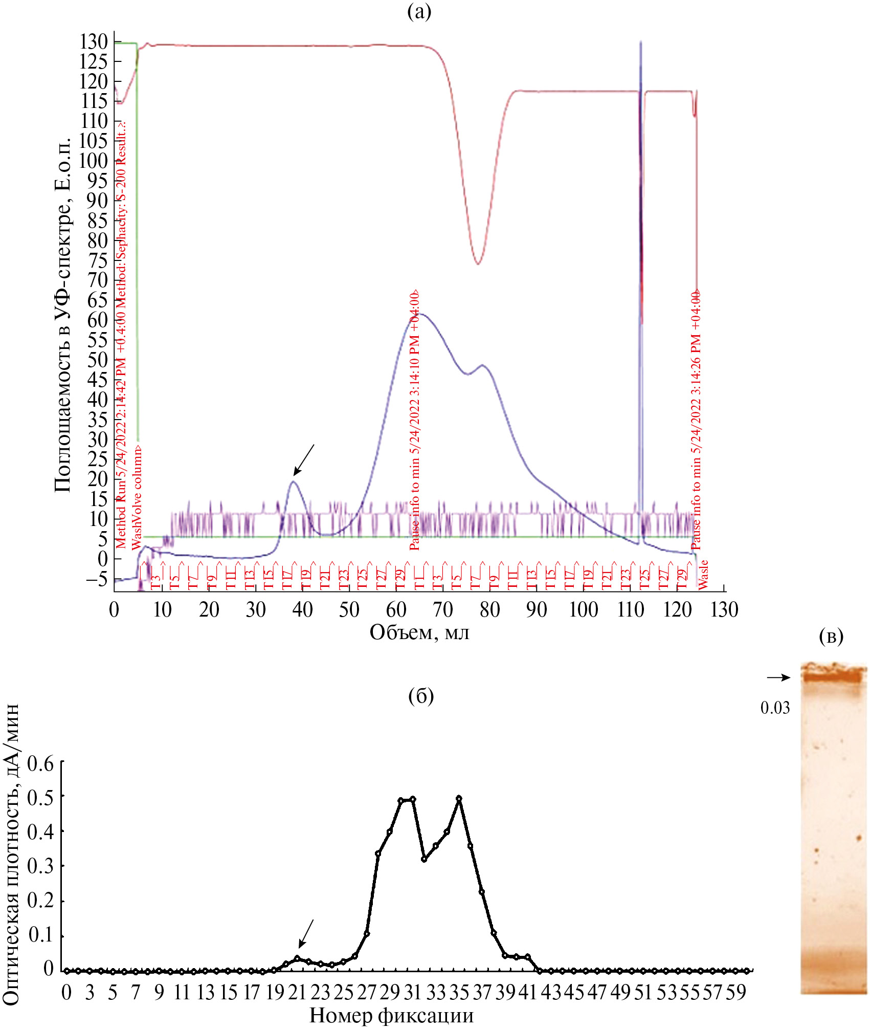 Рис. 2. Минорная катионная пероксидаза (МКП) проростков сорго веничного (Sorghum bicolor) на хроматограмме в УФ-спектре (а), графике распределения пероксидазной активности по профилю хроматограммы (б) и зимограмме после гель-фильтрации (в). Е.о.п. – единицы оптической плотности.