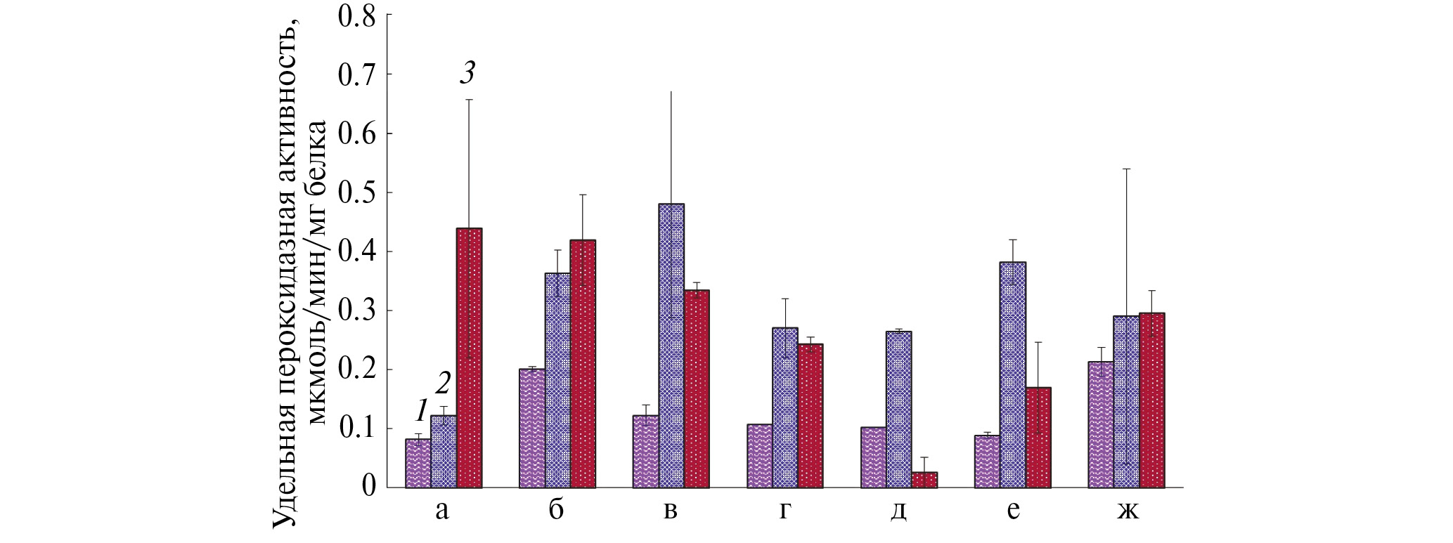 Сокращения: АФА – активные формы азота; МКП – минорная катионная пероксидаза; о-ДАЗ – о-дианизидин; ПАУ – полициклические ароматические углеводороды; СОДС – супероксиддисмутазная система; АБТС – 2,2'-азино-бис-(3-этилбензотиазолин-6-сульфонат) аммония; АСК – аскорбиновая кислота; ДМФ – 2,6-диметоксифенол; Rf – относительная подвижность белка.