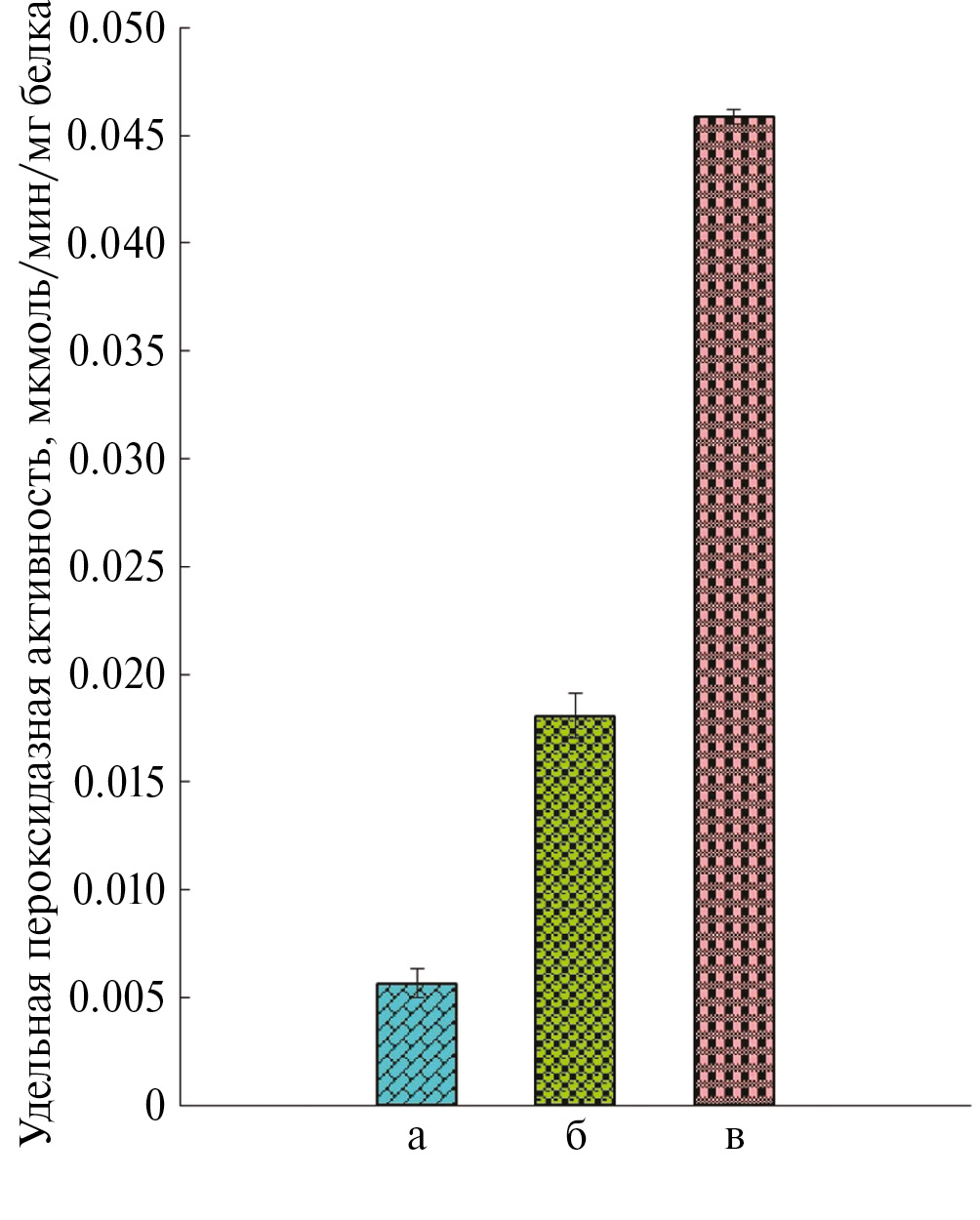 Влияние органических загрязнителей на активность пероксидазной системы сорго определяли путем добавления в среду трехкольцевых ПАУ. На наличие количественных изменений указывали показатели удельной пероксидазной активности ферментных препаратов. В частности, было установлено, что активность очищенной МКП из проростков, выращенных в среде с добавлением фенантрена и антрацена, по отношению к АБТС превышала контрольные значения в 3 (рис. 6б) и 8 раз (рис. 6в) соответственно.